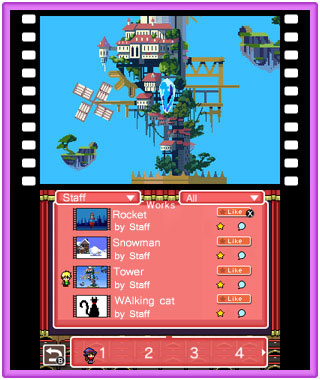 Any scene of the work can be saved as a picture. The saved scene is treated the same as the picture taken with the 3DS camera, and it can be confirmed in the same way as other pictures.